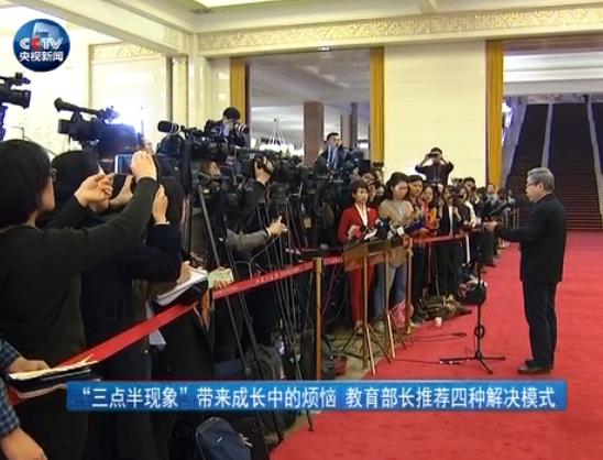 教育部部长 陈宝生:三点半现象之所以会成为年轻父母们和整个社会关注的一个难题,这是中国经济社会发展,中国教育发展特定阶段的一个产物。它有什么特点呢?就是关心这个问题的年轻父母们,他们正处在职业发展的关键阶段,他们正处于孩子宝贝抚育的关键阶段,这个现象表现在大中城市,他们没有时间校后去接孩子,但是孩子到三点半就得放学,这个时间是这样。就是三点半之前孩子是在校学习时间,这个责任是学校的。三点半之后孩子是在家生活的时间,这个责任是家长的。但是由于分工,由于作息时间的不匹配,他们没有办法去接孩子,所以就造成了很大的困扰,带来了一种成长中的烦恼,发展中的困难。