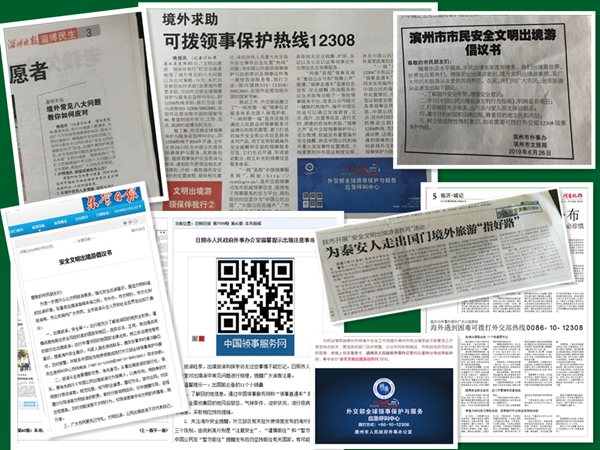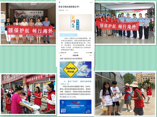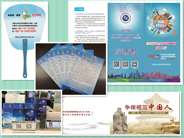 为进一步提升我省出国公民的文明素质和海外安全防范意识,6月下旬至7月底,山东省外办横向联合省委宣传部、省文化和旅游厅、省公安厅等部门,纵向发动各市县外办,省市县三级总动员,在全省集中开展了“领保伴你行”暑期安全文明出境游宣传月活动。据不完全统计,共举办现场宣传活动391次,发放宣传资料12.3万份,制作展板、条幅1656个;通过山东卫视、各市卫视等省内主流媒体报道新闻或播放宣传视频628次,在齐鲁晚报及各市日报等省市主流报纸报道或刊发出境游安全知识133次,同时通过微信、网页、新闻客户端等新媒体向社会同步宣传,受众共达几百万人次,在全省打造了立体式、全覆盖的宣传网络。